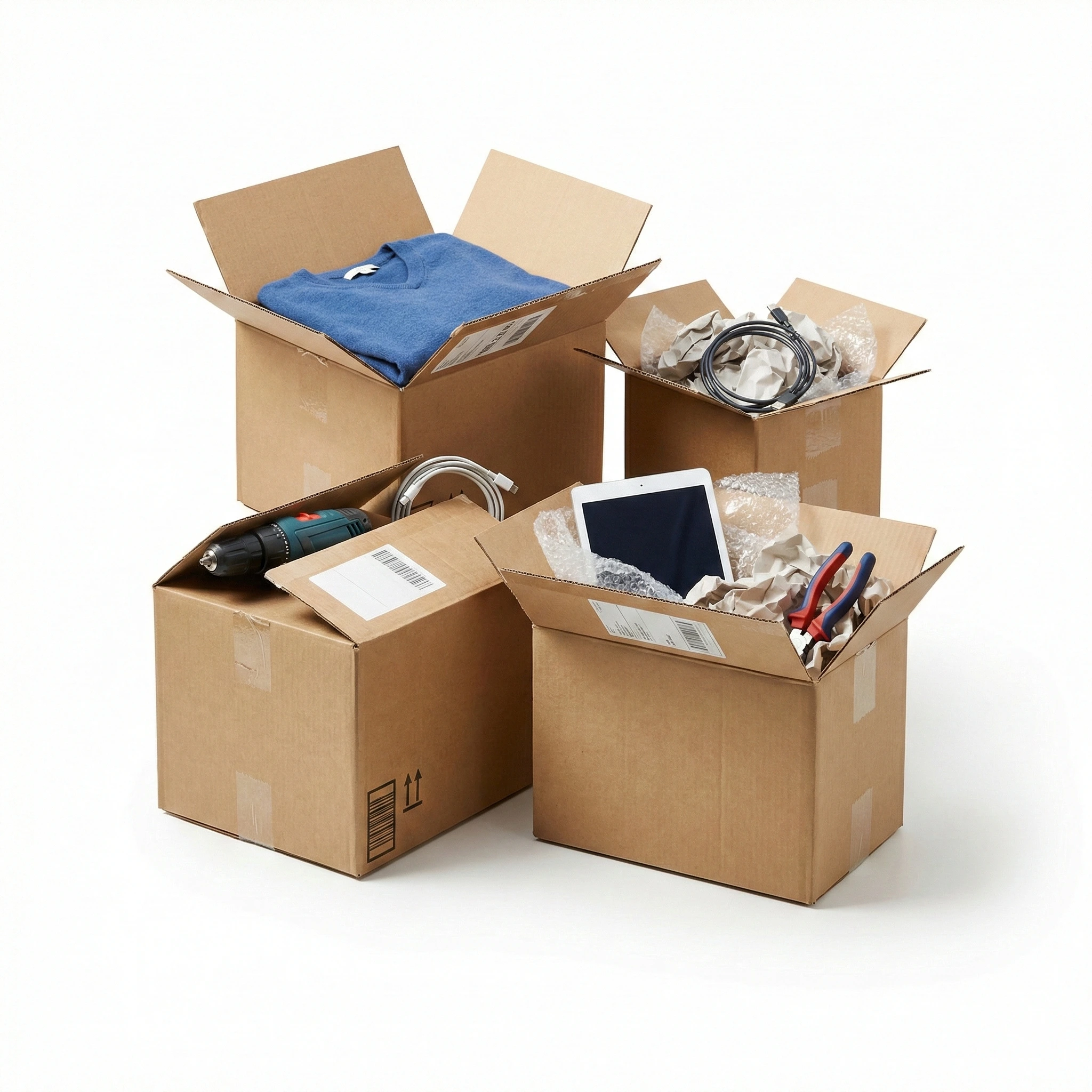 مجموعة متنوعة من منتجات منزلية وإلكترونية وملابس بجانب كراتين شحن، تعكس تنوع البضائع المستوردة.